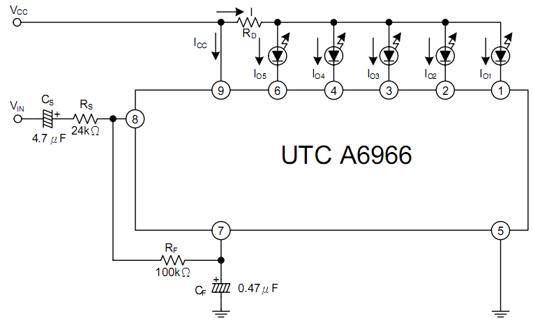 The UTC A6966 is designed for 5 LED level meter driver in 9 lead