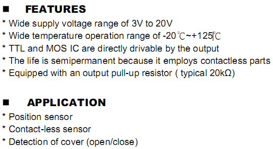 magnetic field especially at low supply voltage and operation over extended temperature ranges to +125℃ .This Hall IC is suitable for application to various kinds of sensors, contact-less switches, and the like.